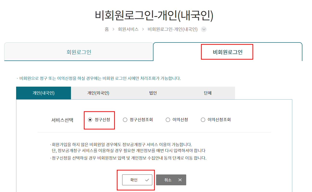 3. 비회원 로그인을 해주세요. 회원가입이 되어 있다면 회원 로그인 하셔도 되지만, 비회원 로그인으로도 청구 신청이 충분히 가능하기 때문에 저는 비회원 로그인으로 진행하였습니다. 단, 비회원 로그인 하여 청구 신청을 하실 경우에는 중간에 임시 저장이 되지 않기 때문에 필요한 서류를 미리 모두 파일로 준비해 주세요.