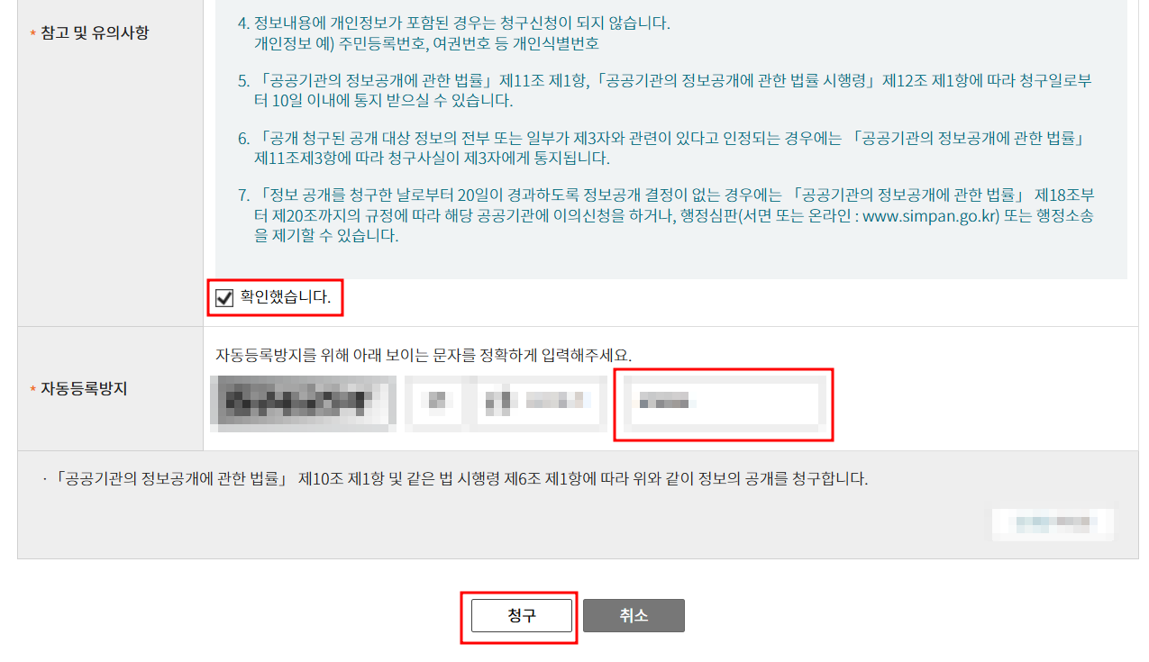 8. 청구인정보를 확인해 주시고 카카오 알림톡과 메일 수신여부를 '수신'으로 선택해 주신 후, '참고 및 유의사항'을 확인하고 자동등록방지 숫자를 기입한 후에 [청구] 버튼을 눌러주시면 됩니다.