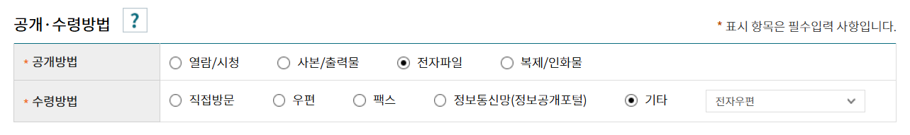 7. 공개, 수령방법은 편하신 대로 해주시면 됩니다. 저는 전자우편 수령을 선택하였습니다.