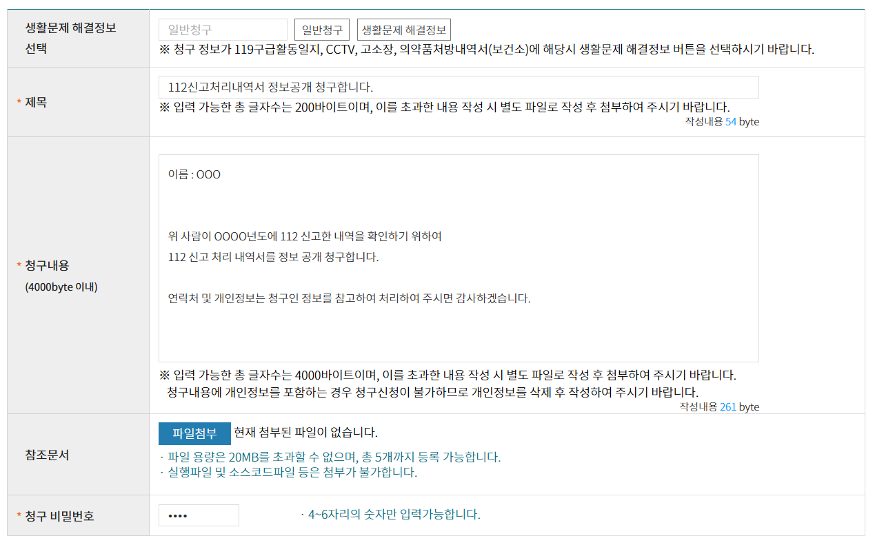 제목에는 '112 신고 처리 내역서 정보 공개 청구합니다.' 라고 써주시면 됩니다. 청구 내용에는 본인 이름과 함께 언제 신고한 내역을 확인하고자 하는지 명시해주시면 됩니다. 청구내용 란에는 연락처 및 주민등록번호와 같은 개인정보가 기재되면 처리가 불가하기 때문에 개인정보는 청구인 정보를 참고해 달라고 기재해 두시면 됩니다.
